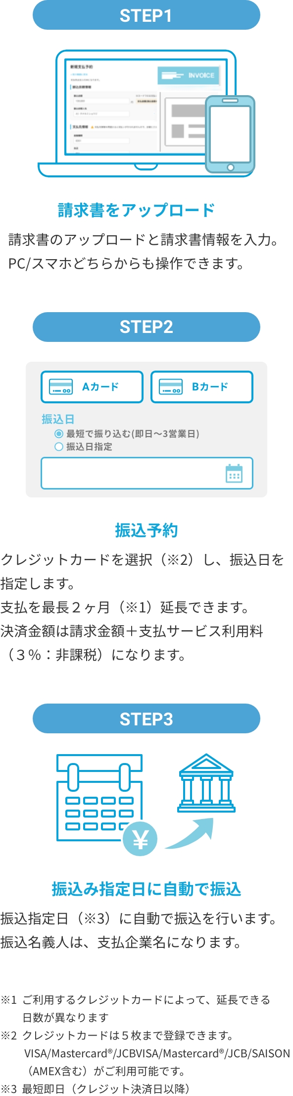 請求書をクレジットカード等で支払えるので、最長2ヶ月、実際のお支払を繰り延べできます。 クレジットカードはVISA、Mastercard®、JCB、SAISON(AMEX含む)からお選びいただけます。