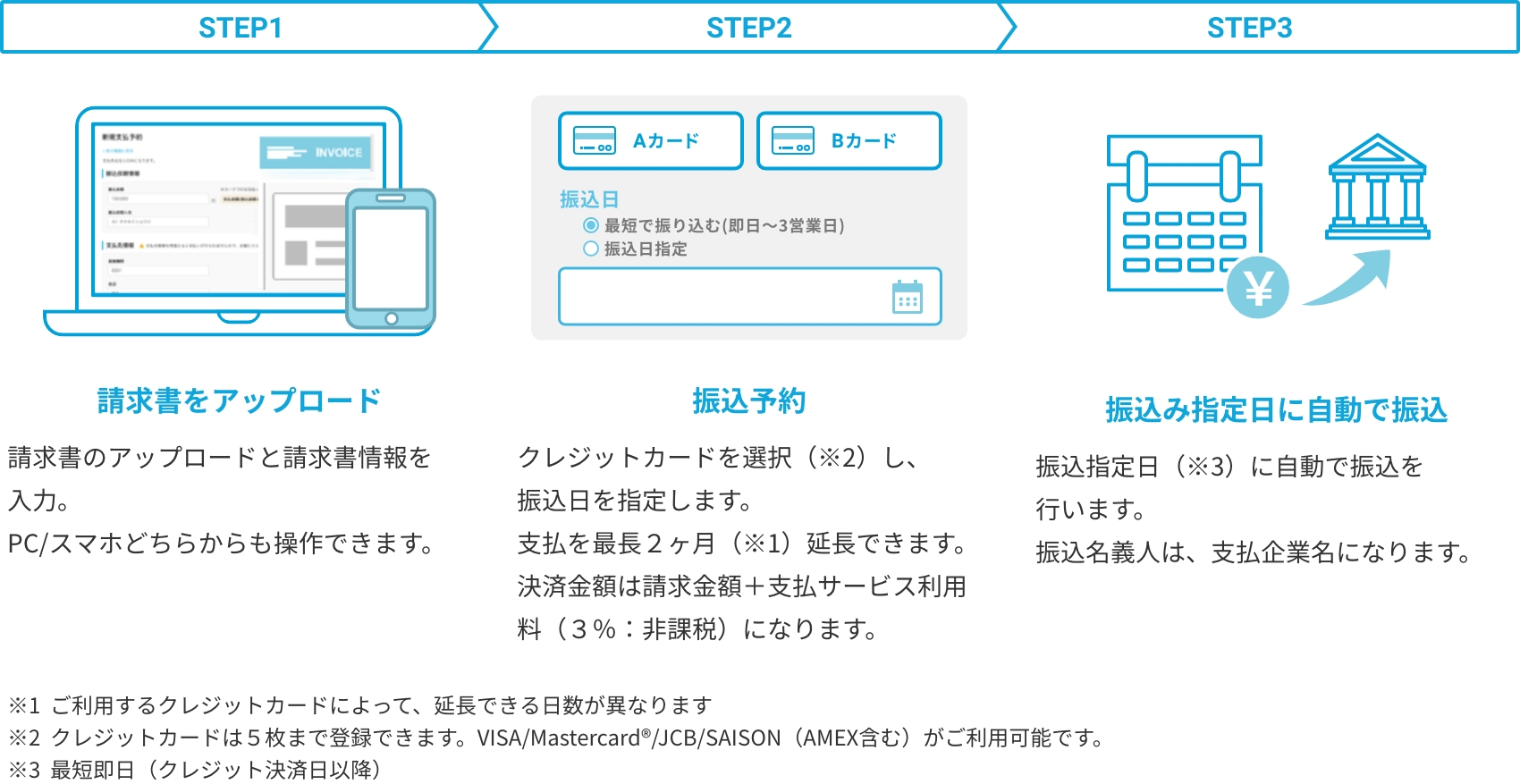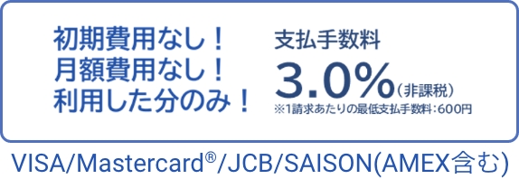 請求書をクレジットカード等で支払えるので、最長2ヶ月、実際のお支払を繰り延べできます。 クレジットカードはVISA、Mastercard®、JCB、SAISON(AMEX含む)からお選びいただけます。